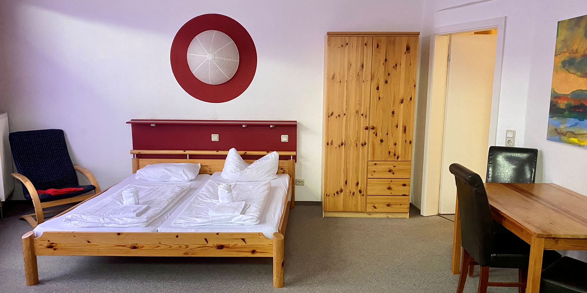 Ausstattung: Doppelbett 140 x 200 cm, kleine Sitzgelegenheit